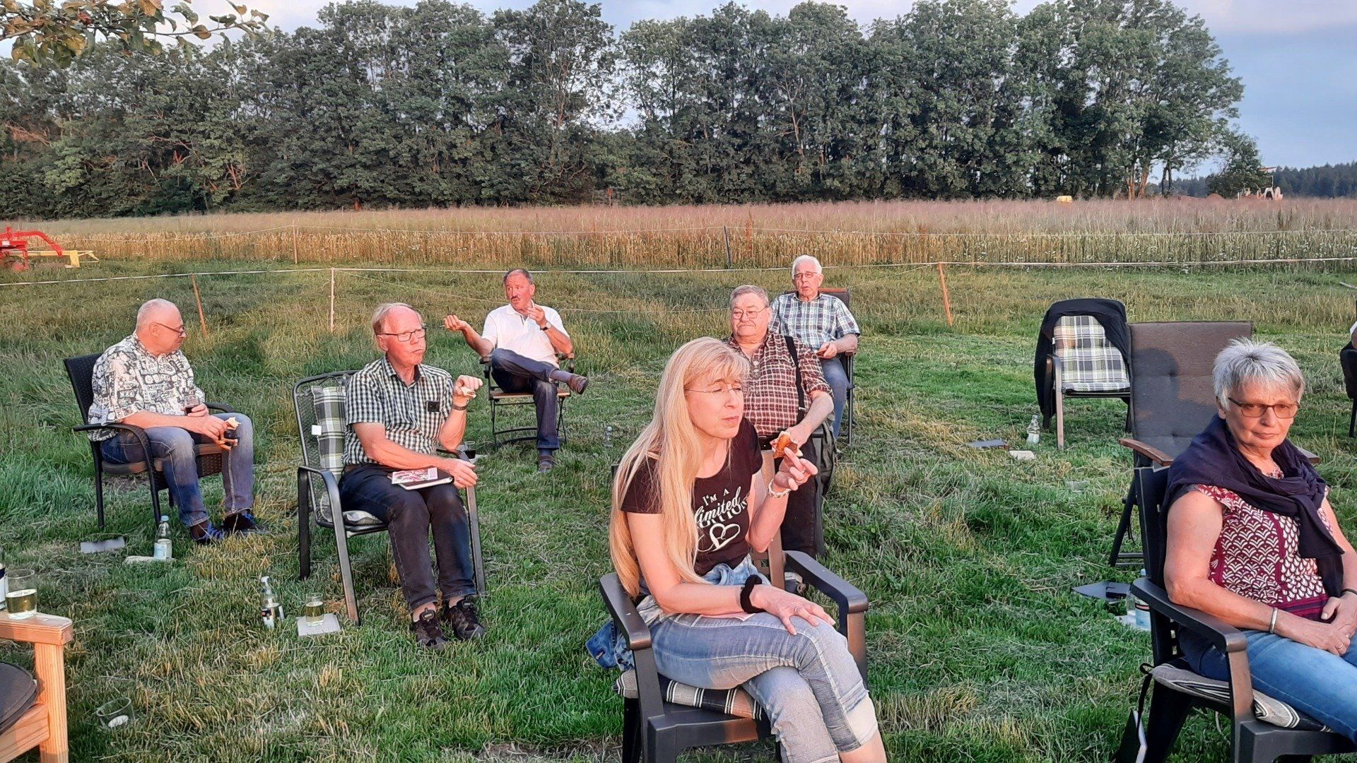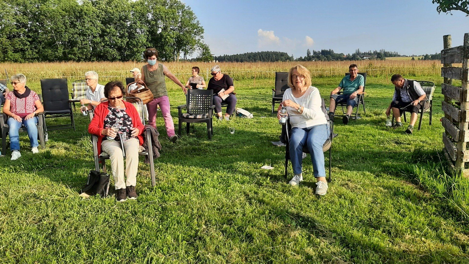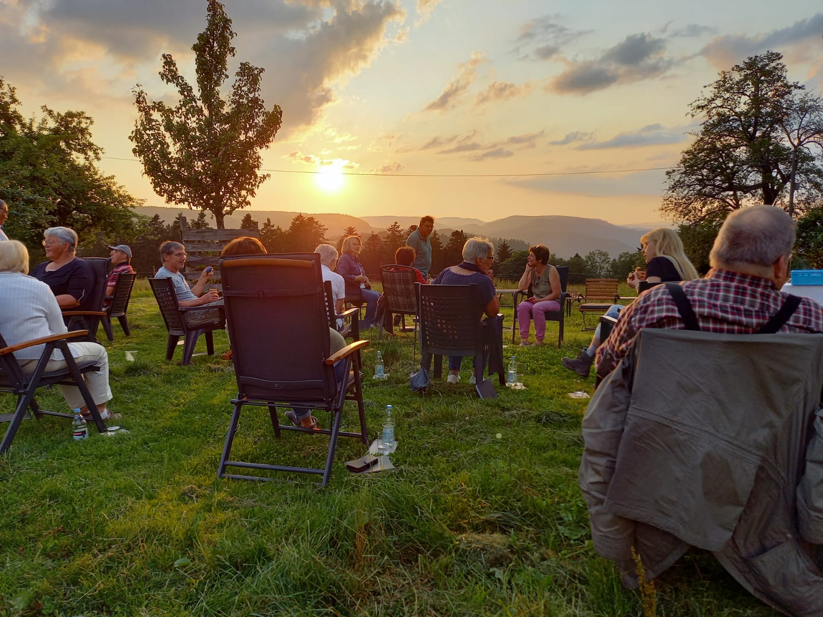 Eine erste Singstunde im Freien nach langer Coronapause. Anne und Gertrud haben uns auf dem Wiesengelände am Kasperleshof aufs beste bewirtet. Es war wunderschön beim zwanglosen Singen ins Tal. Vor uns ein wunderschöner Sonnenuntergang und hinter uns zeigte sich bereits der Mond über den Tannenspitzen.