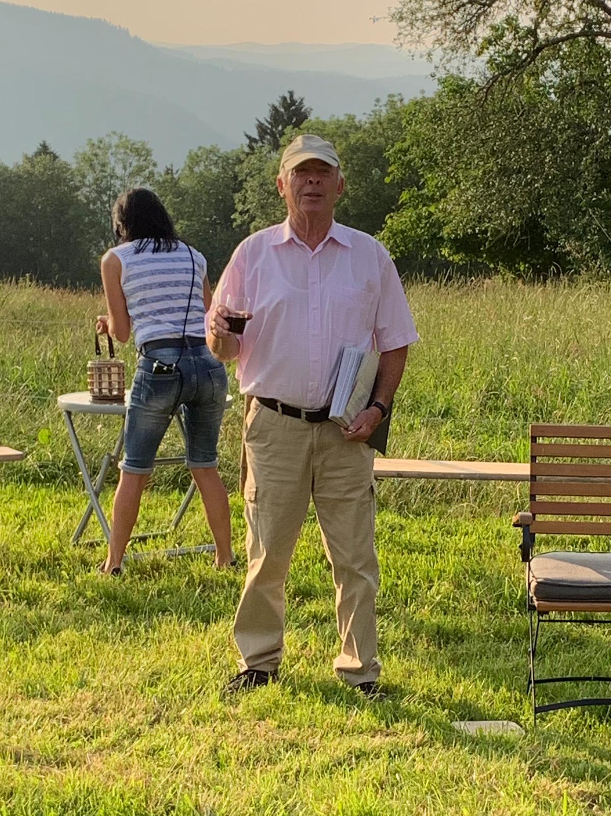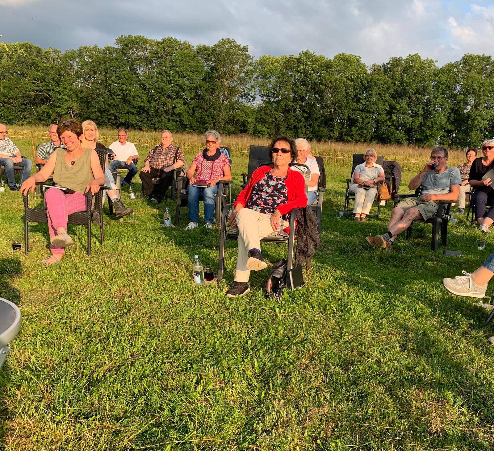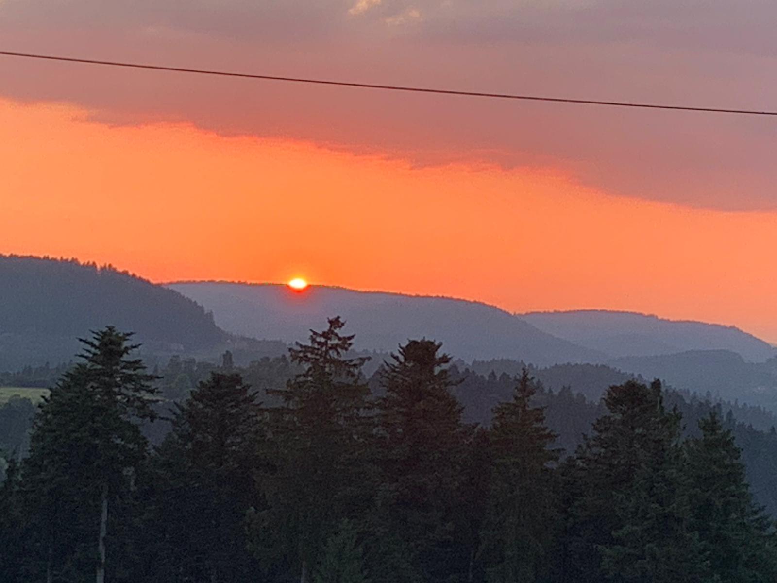 Eine erste Singstunde im Freien nach langer Coronapause. Anne und Gertrud haben uns auf dem Wiesengelände am Kasperleshof aufs beste bewirtet. Es war wunderschön beim zwanglosen Singen ins Tal. Vor uns ein wunderschöner Sonnenuntergang und hinter uns zeigte sich bereits der Mond über den Tannenspitzen.
