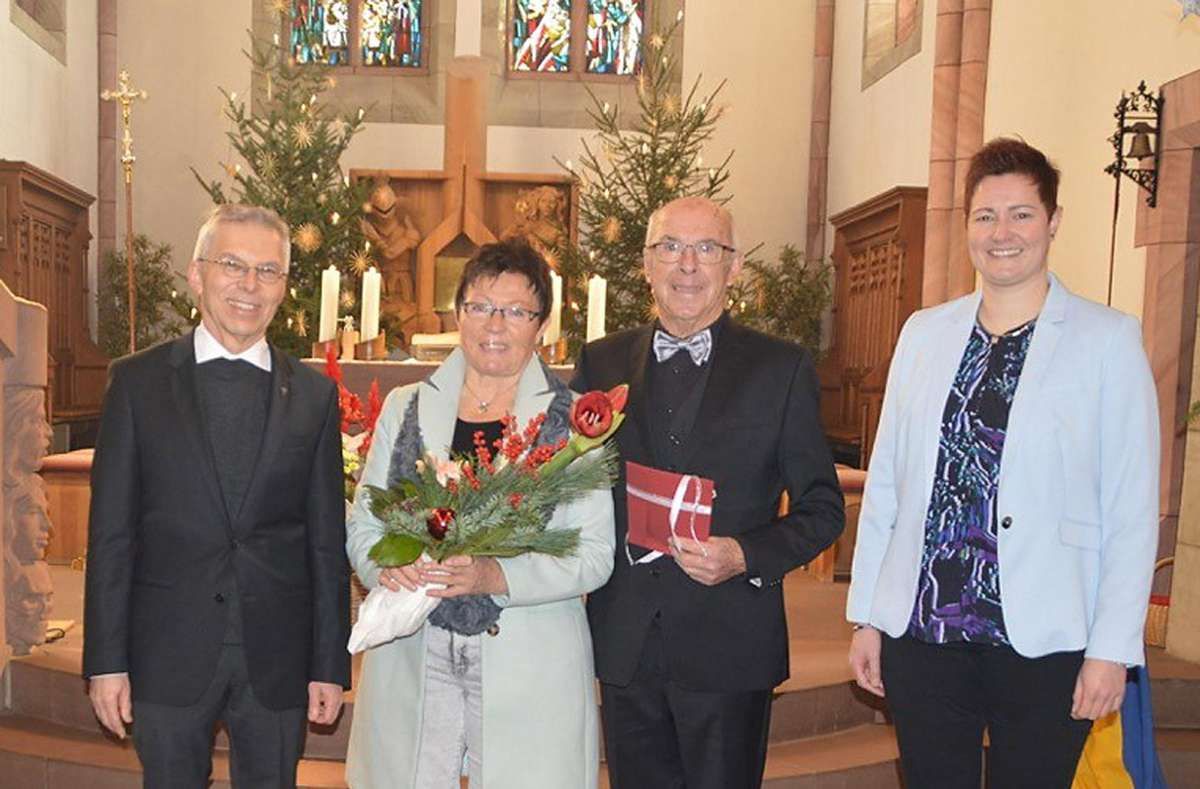 Geehrt wurden für goldene 50 Jahre Engagement die Sängerin und Co-Vorsitzende Gertrud Moosmann und der langjährige Hauptorganist und Basssänger Alois Menrad. Ihre Wunschlieder konnten sich die Jubilare schon im vorausgehenden Gottesdienst anhören, der vom Kirchenchor mitgestaltet wurde. Geleitet von Dirigentin Marta Kulzer Ribeiro, erklang auf Wunsch von Gertrud Moosmann die Jubelkantate „O be joyful in the Lord all ye lands“ aus der Feder des modernen Kirchenkomponisten Charles V. Stanford. Auch das ursprünglich barocke Wunschlied von Jubilar Menrad mit dem Titel „Stimmt unserm Gott ein Loblied an“, dessen Melodie im 20. Jahrhundert von Paul Kickstat mit einem vierstimmigen Satz versehen wurde, rief zum Lobe Gottes auf.